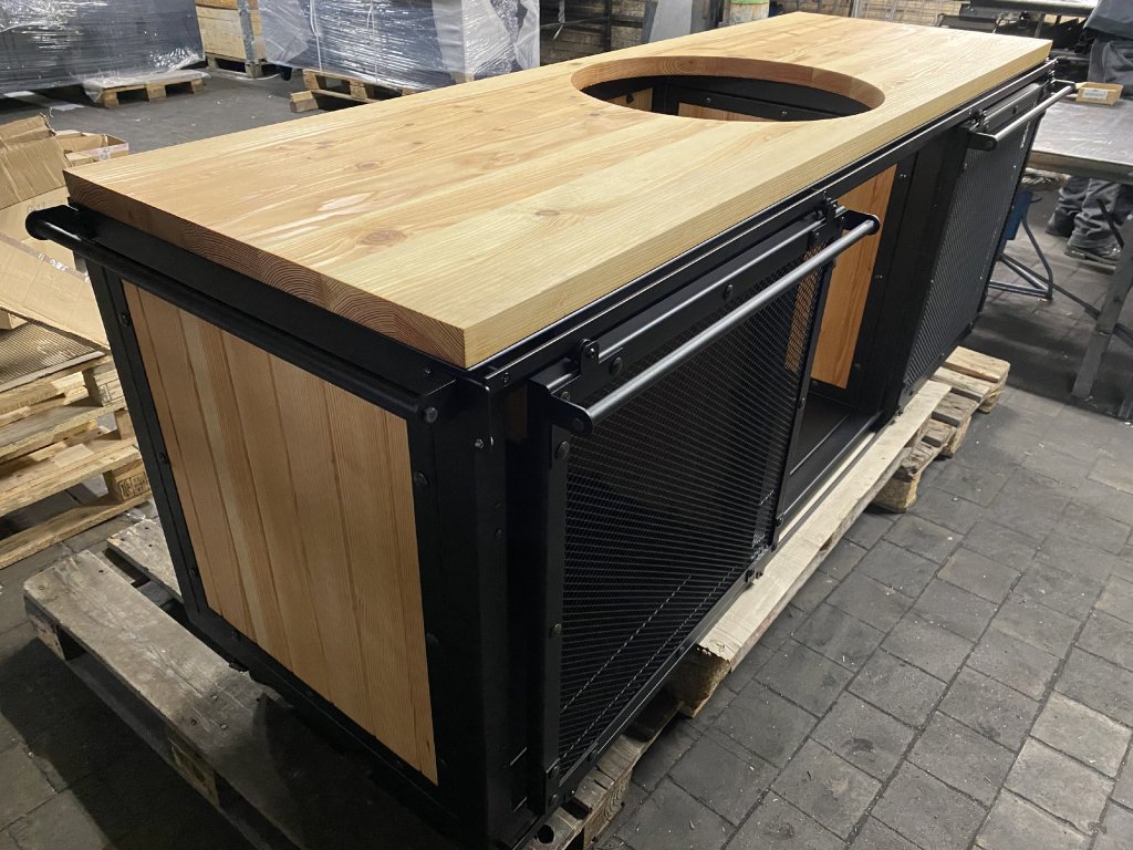 Prostřední sekce je připravena pro zapuštění grilu Kamado, krajní části obsahují vnitřní plechové police pro grilovací kleště, nástroje, nádobí nebo uhlí. Všechno přehledně a po ruce.