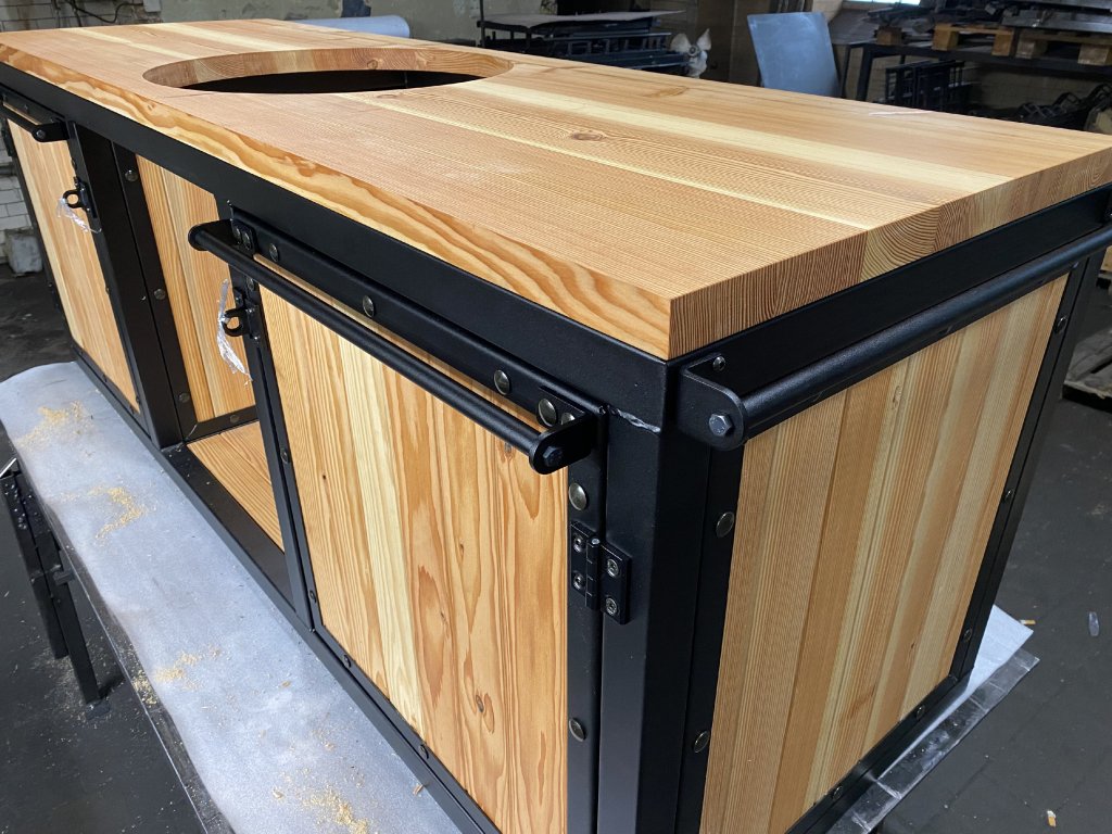 Kuchyně má tři samostatné sekce – prostřední je určená pro keramický gril typu Kamado, krajní části slouží jako úložné prostory s otevíracími dvířky. Uvnitř najdete dvě plechové police, které pomáhají uspořádat nádobí, palivo nebo příslušenství.