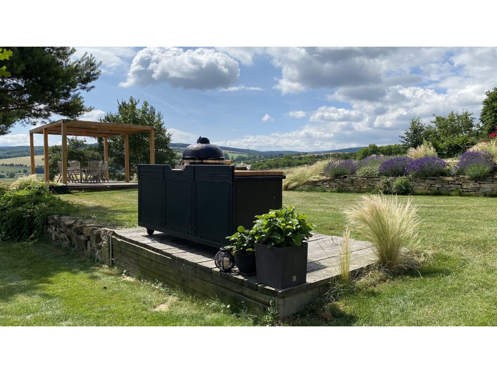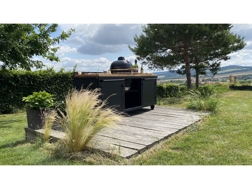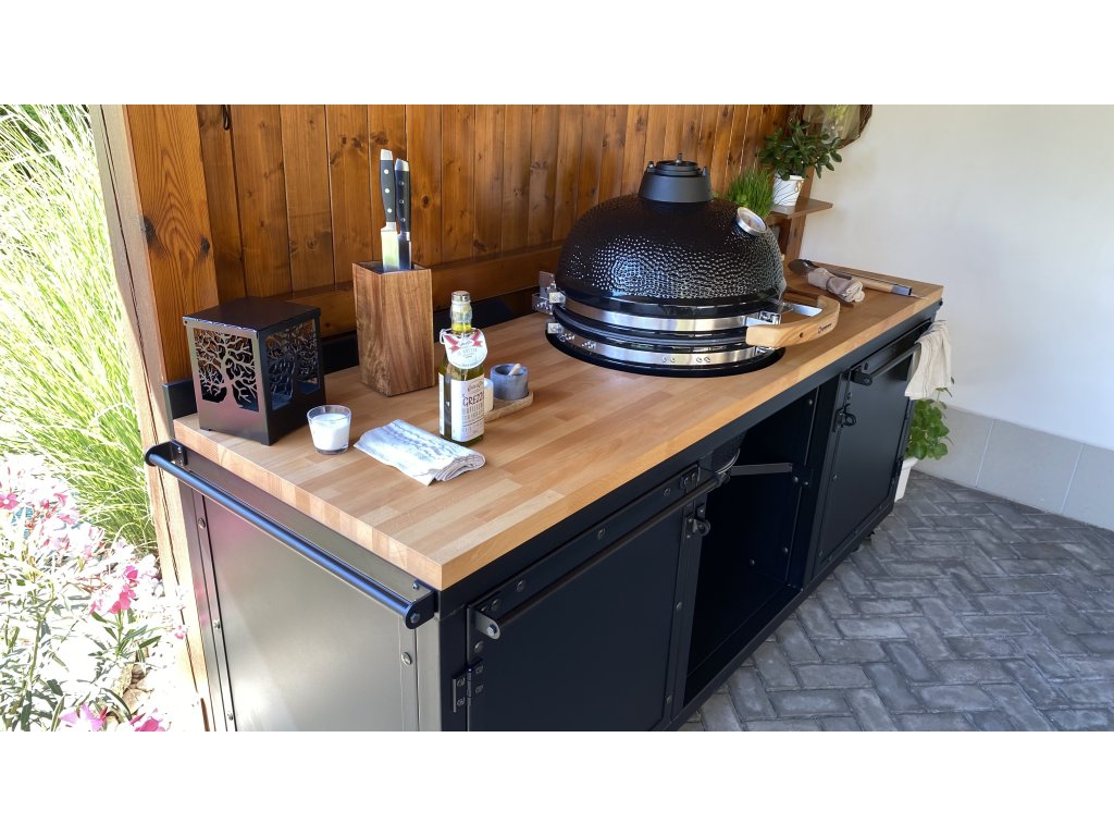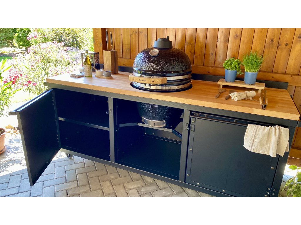 Odolná třísekční venkovní, zahradní kuchyně s výplněmi z ocelového plechu a pevnou konstrukcí z lakované oceli. Navržena pro gril Kamado i běžné vaření venku. Vhodná na terasu, zahradu nebo pod přístřešek. Vyrobeno v Česku.