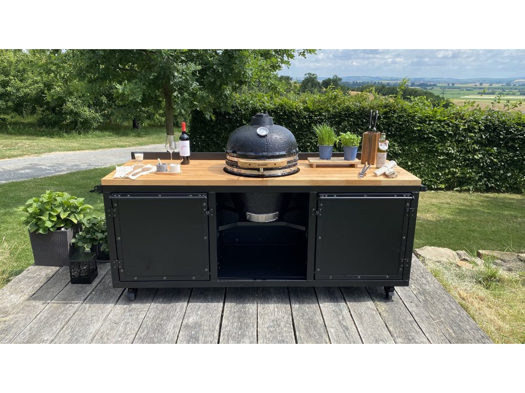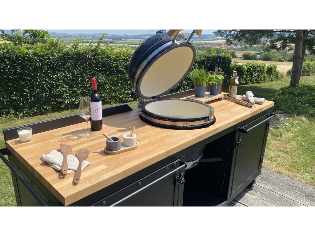 Horní pracovní deska z masivního dubu ošetřená přírodním olejem je připravena pro zapuštěné umístění keramického grilu typu Kamado do průměru 57 cm. Z vrchu zůstává viditelné pouze víko, zatímco spodní část grilu je snadno přístupná v otevřené střední sekci. Vzhledem k pevnosti konstrukce není třeba se bát ani grilů s vyšší hmotností.